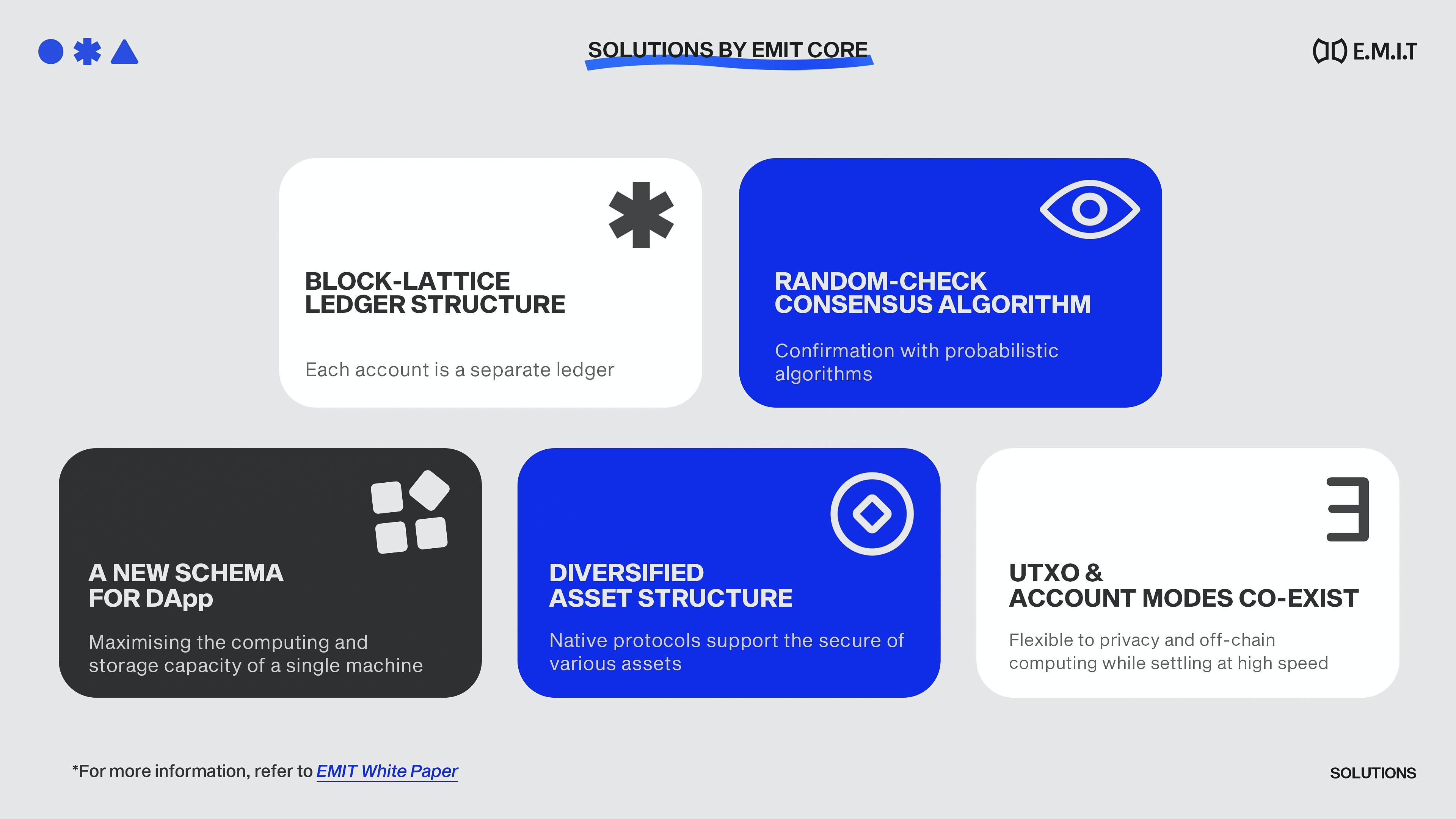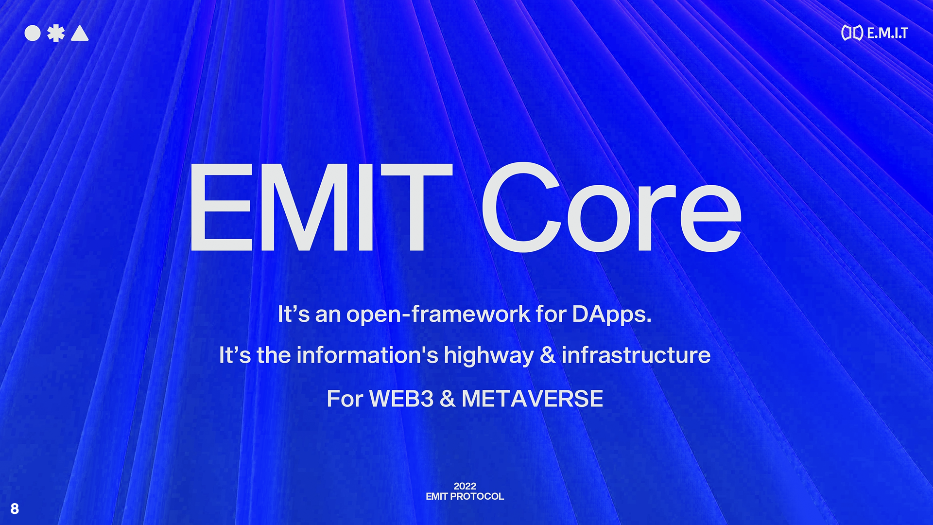 EMIT Core is the elastic blockchain infrastructure based on Block Lattice. EMIT Core is an open-framework for DApps. It's the information’s highway & infrastructure for WEB3 & METAVERSE